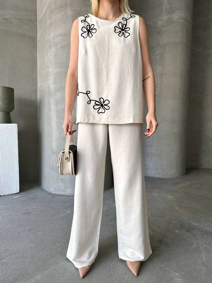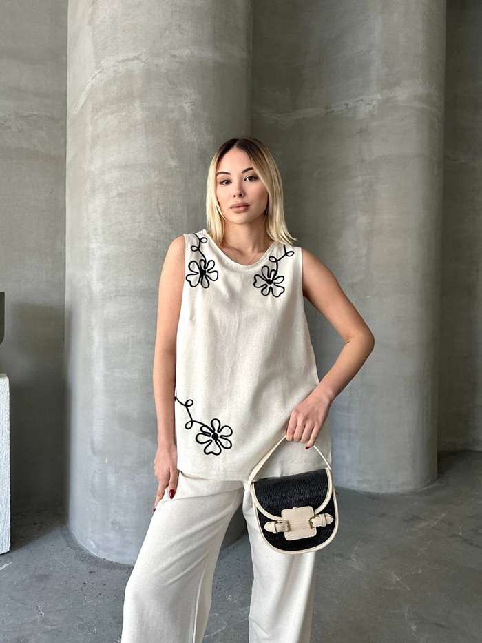 Ένα εκπληκτικό σύνολο από λινό τοπ με κεντητά λουλούδια και ασορτί φαρδιά παντελόνα.