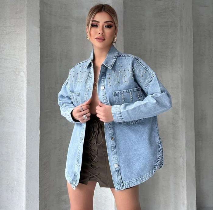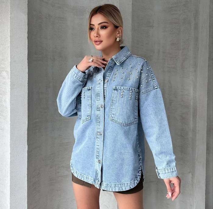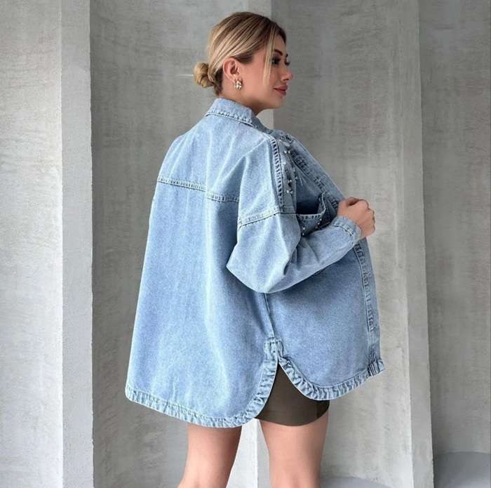 Στυλάτο τζιν πουκάμισο με στρας και oversized εφαρμογή — ιδανικό για casual ή streetwear looks.
